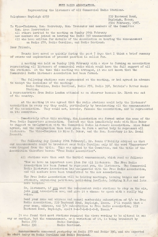 soon merged and, following notification from Ronan O'Rahilly that Radio Caroline would only carry announcements if the word 'supporters' was dropped from its title, the organisation became known as the Free Radio Association (FRA). Announcements for the FRA were broadcast on most of the remaining offshore stations advertising a range of publicity material -